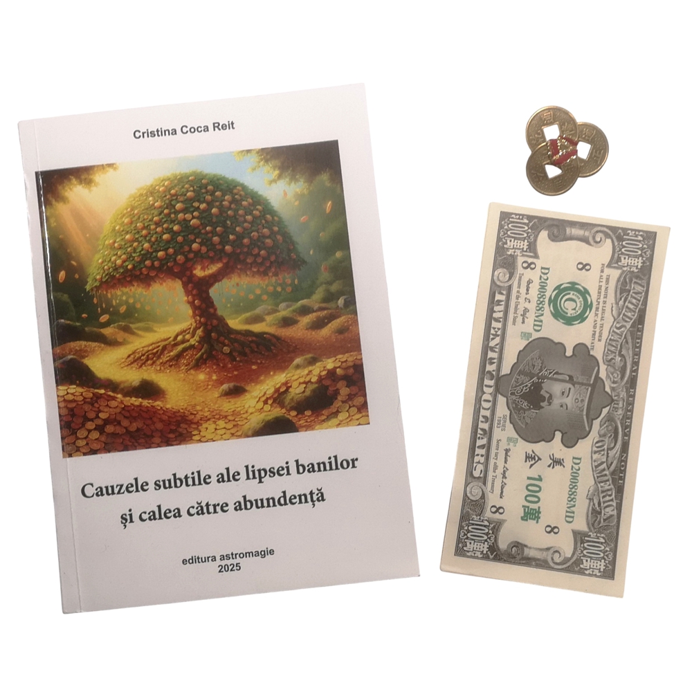 Kit compus din carte in limba romana, bancnote pentru prosperitate si monede legate cu snur rosu pentru atragerea banilor si blocarea risipei.